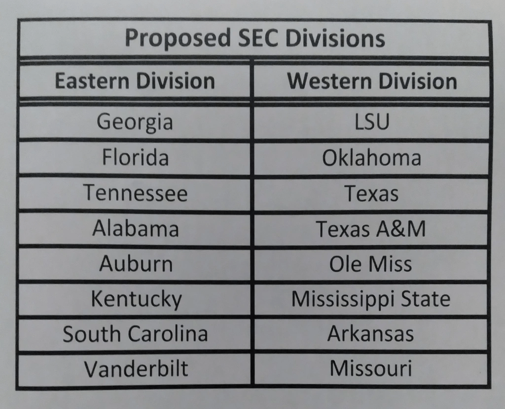 My proposal is simple. Keep the East and West divisional structure. Add Texas and Oklahoma to the SEC West. Move Missouri to the SEC West. Move Auburn and Alabama to the SEC East. Eliminate cross-division traditional rivalries (more on this later)! Go to a nine game SEC schedule, which would match the other power 5 conferences. This will preserve an exciting conference championship game with a lower probability of a rematch between the two divisional champs. It preserves the prestige of being a divisional champ, which is enhanced by even stronger 8 team divisions. I think this would also make it almost a slam dunk that the SEC would get at least two teams into the CFP most years. Here are the proposed divisions: